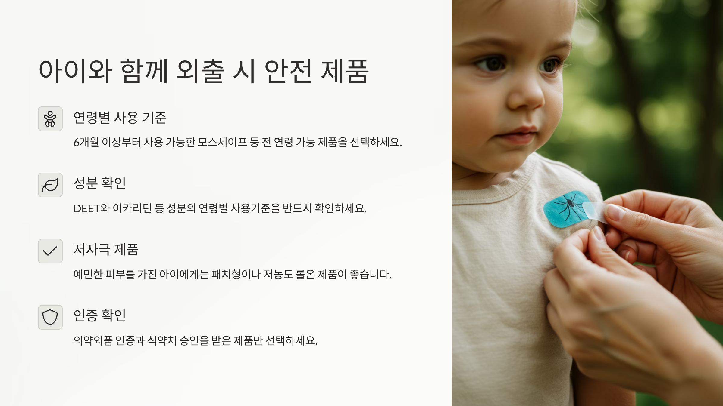 아이와 함께 외출할 때는 반드시 **피부 자극이 적고 DEET-Free 제품**을 사용하는 게 좋아요. 특히 만 2세 이하 유아의 경우 피부 흡수가 빠르기 때문에 화학 성분은 피해야 해요. 🧼